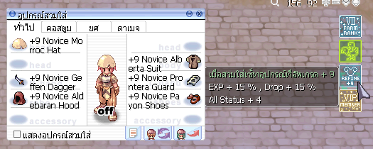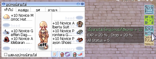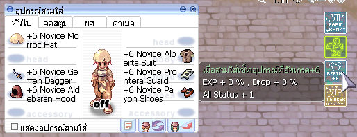 เมื่อผู้เล่นตีบวกอุปกรณ์ครบ 6 ชิ้น ตามในรูปตัวอย่าง จะได้รับ Status พิเศษเพิ่มขึ้น
